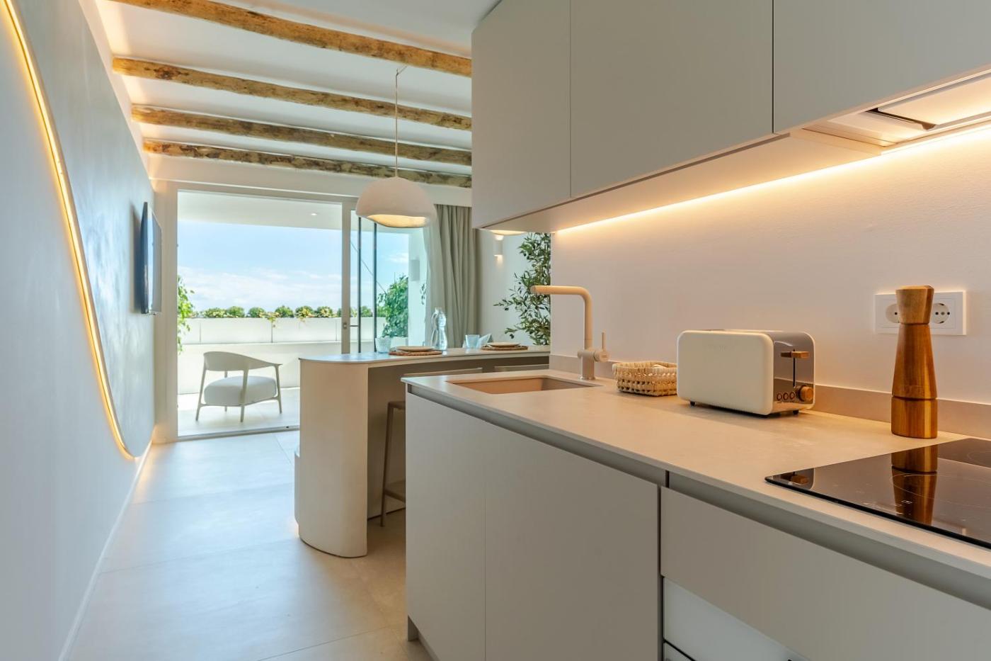 One-Bedroom Apartment with Sea View and Terrace. This apartment features 1 living room, 1 separate bedroom and 1 bathroom with a walk-in shower and free toiletries. The fully equipped kitchen has a stovetop, a refrigerator, kitchenware and an oven. The air-conditioned apartment features a flat-screen TV, a washing machine, soundproof walls, a tea and coffee maker as well as sea views. The unit has 2 beds.