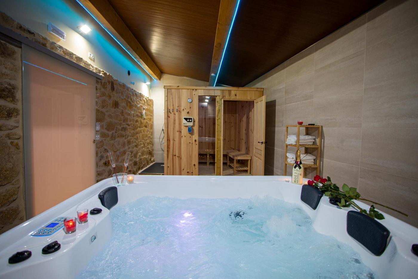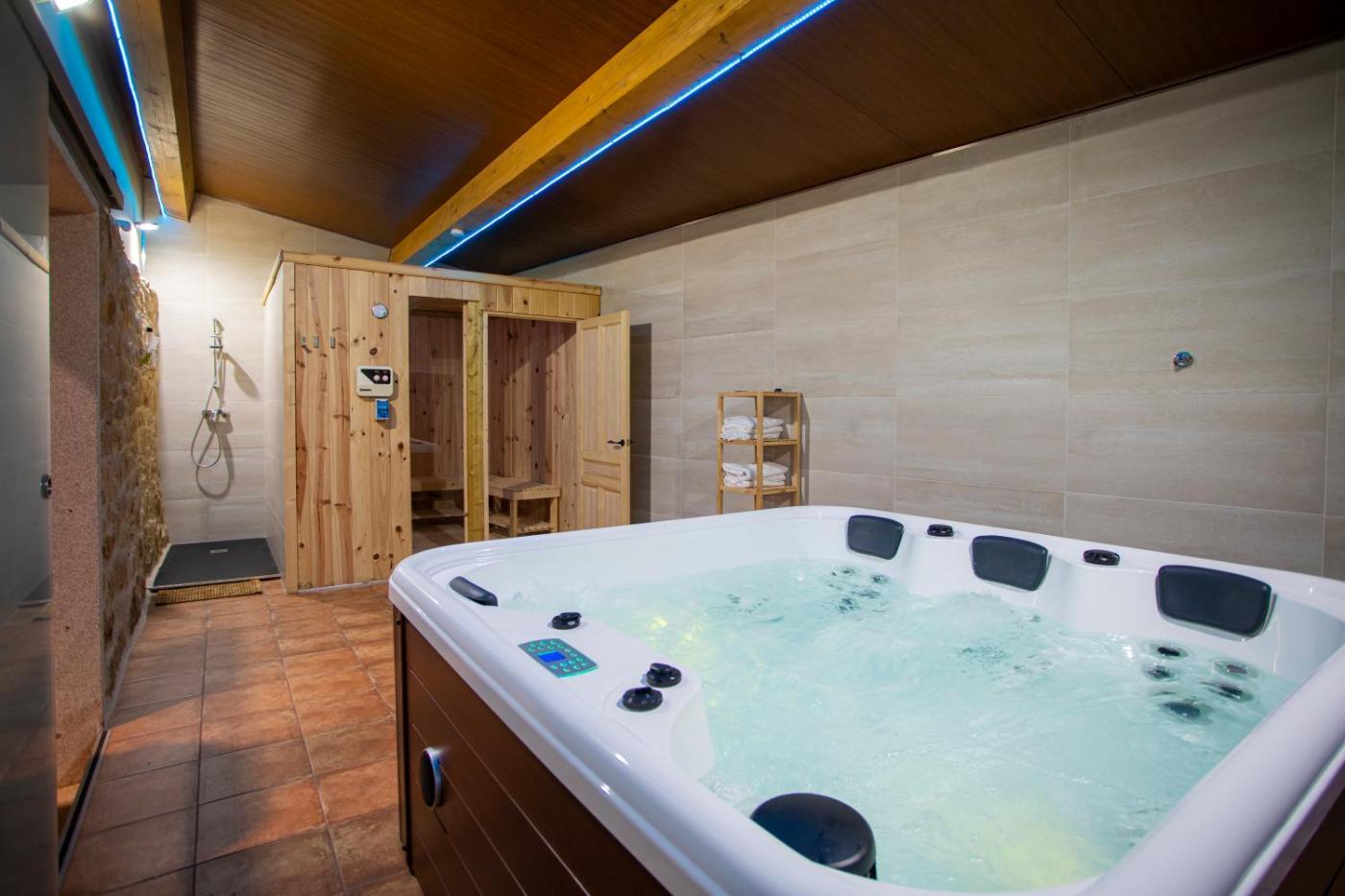 Three-Bedroom House. This luxurious holiday home provides a hot tub, a spa bath and a sauna. This spacious holiday home comes with 1 living room, 3 separate bedrooms and 2 bathrooms with a shower and free toiletries. Guests will find a refrigerator, a dishwasher, kitchenware and an oven in the well-fitted kitchen. The holiday home also includes a barbecue. The air-conditioned holiday home features a flat-screen TV, a washing machine, a private entrance, a coffee machine as well as garden views. The unit has 4 beds.