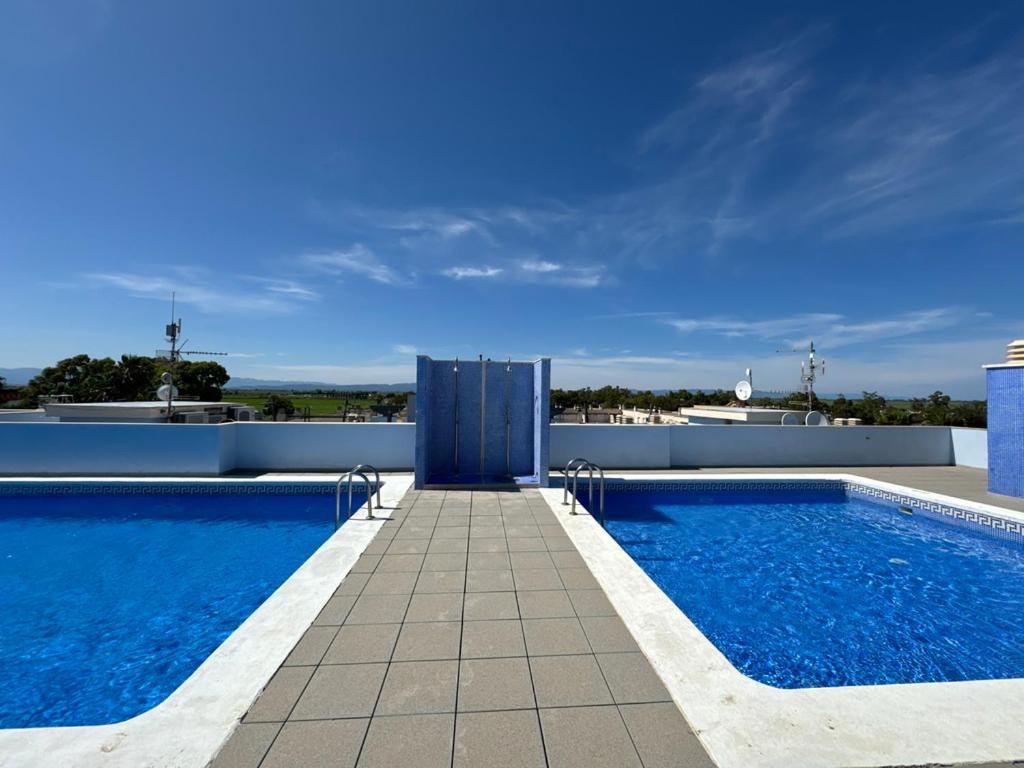The spacious apartment with a terrace and pool views features 2 bedrooms, a living room, a TV, an equipped kitchen with a dishwasher and an oven, and 1 bathroom with a bidet. The property offers quiet street views.